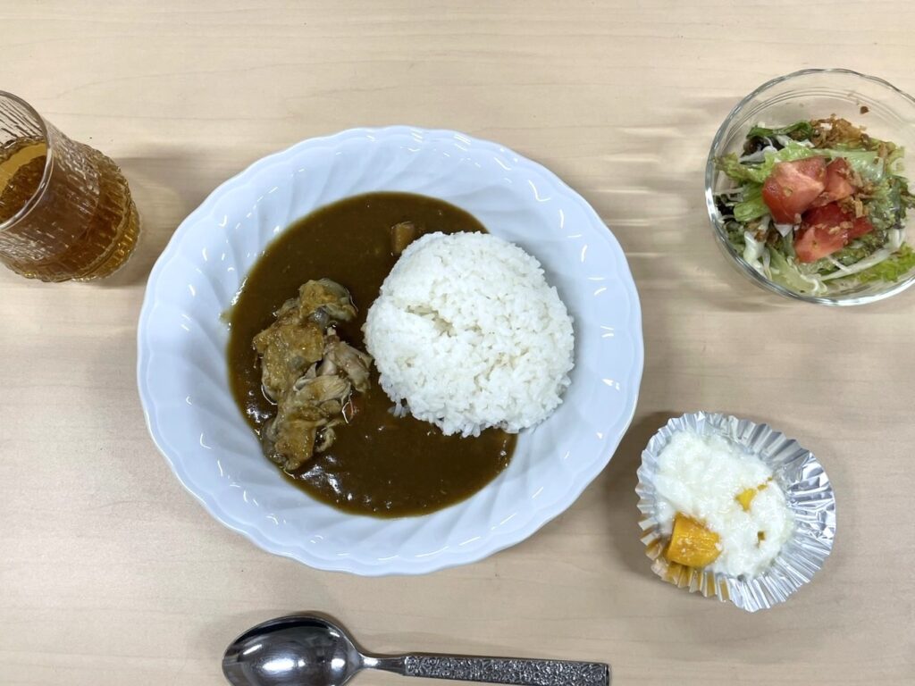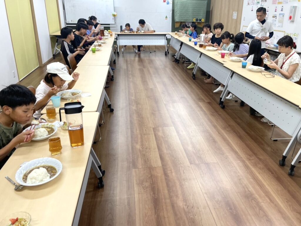 今回は保護者・スタッフを合わせて32名での食卓となりました。メニューは「手羽先のカレー、野菜サラダ、牛乳プリン」。ほとんどの子どもが嬉しそうにお代わりをしてくれました。