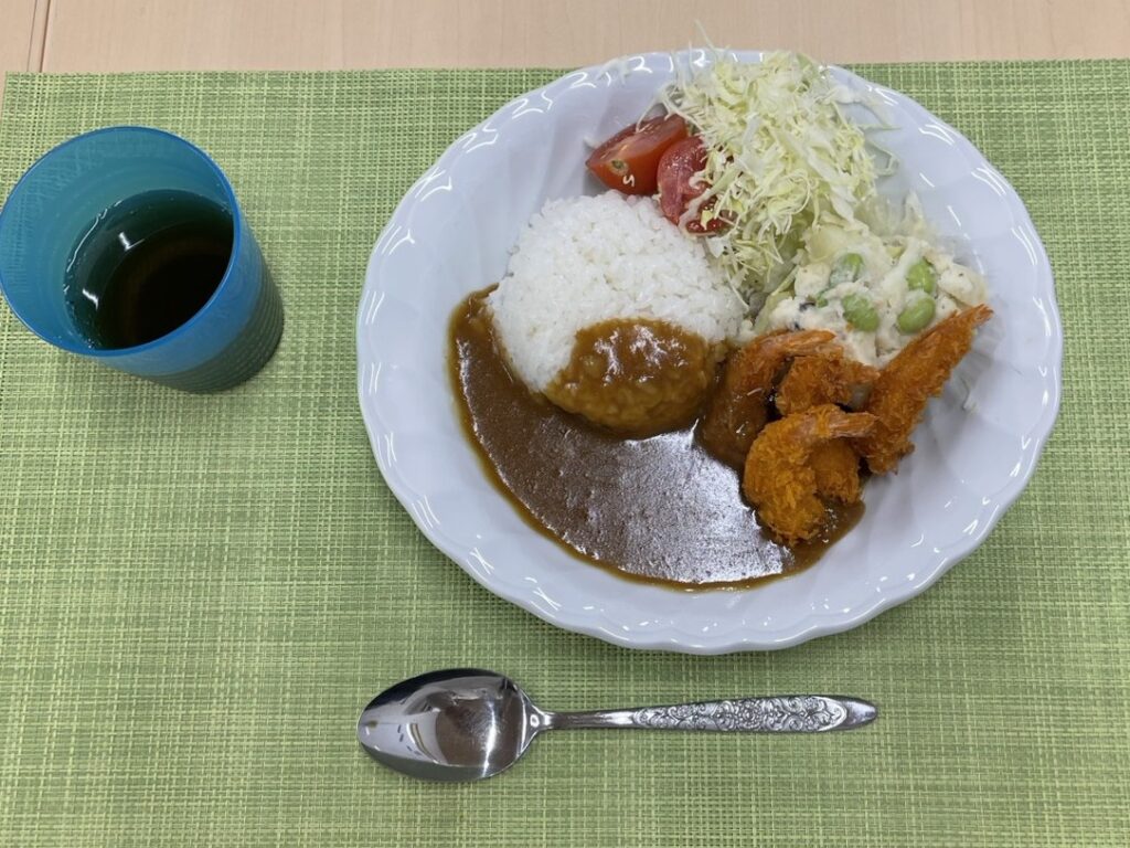メニューは「エビカレーライス、アンチョビポテト、生野菜サラダ」。