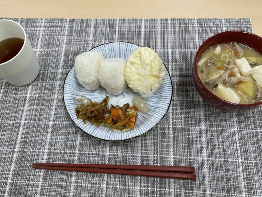 お食事は「おにぎり、豚汁、蒸しパン、お漬物、アルファ化米」というメニュー。スタッフも合わせて33名で、会話を楽しみながらいただきました。