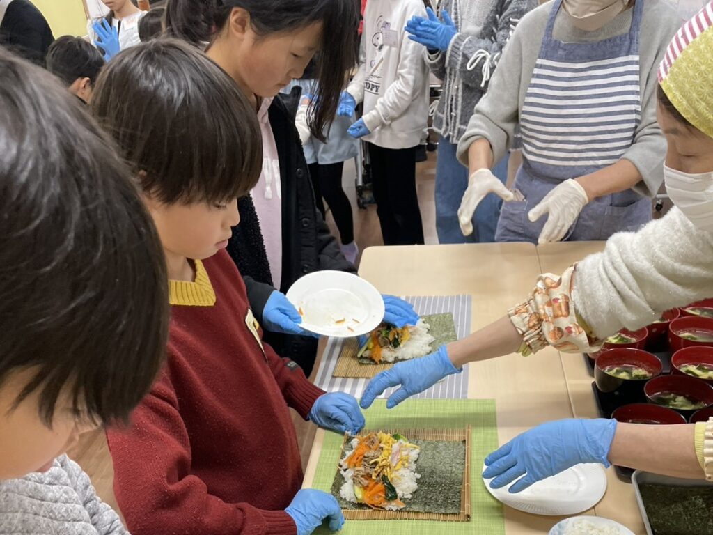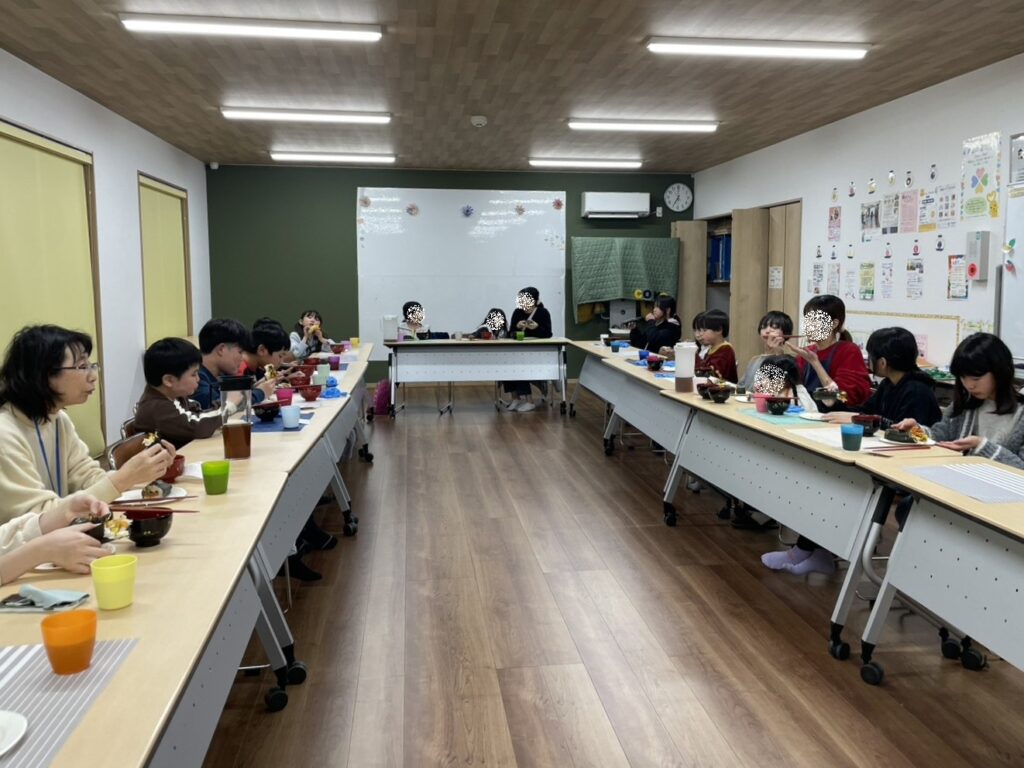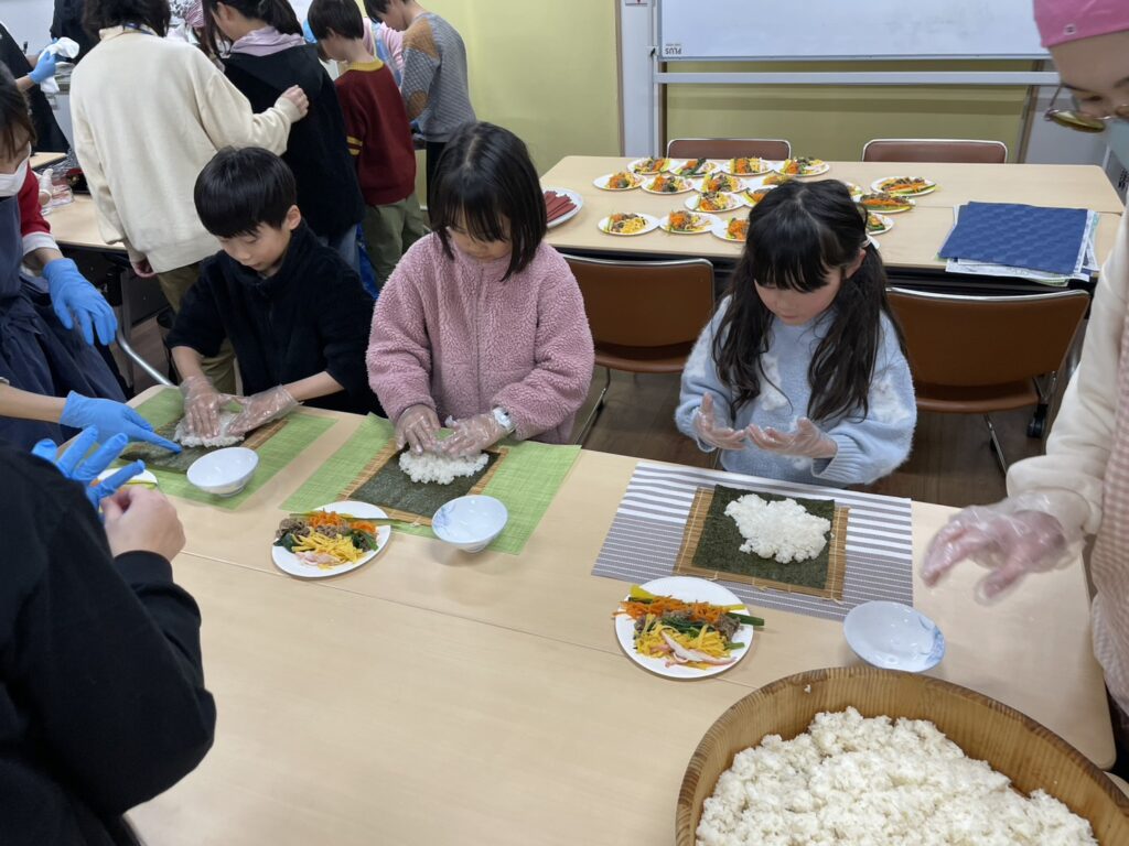この日は節分の後ということもあり、キンパを自分で巻いて食べることの楽しさを知ってもらうために、学びの時間は少し早めに切り上げました。お手本を見せてくださるスタッフさんの前に並んだこどもたちは、説明を聞きながら真剣な表情でした。