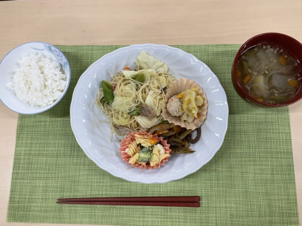 お食事はスタッフも含め25名で一緒にいただきました。今回は、甲子園の手作りお弁当「ぽこた」さんにおかずをご用意いただき、「ビーフン、マカロニサラダ、とり団子と白菜の煮物、きんぴらごぼう、スープ」という心温まる献立でした。