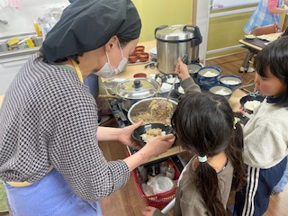 今日は子供たち自身で盛り付けをしてもらうことにしました。具ばかりいれている子や汁だくにする子など、慣れない手つきで入れていました。