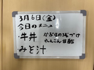 食事タイムのメニューは牛丼、かぶらの浅漬け、レンコンの甘酢、みそ汁でした。