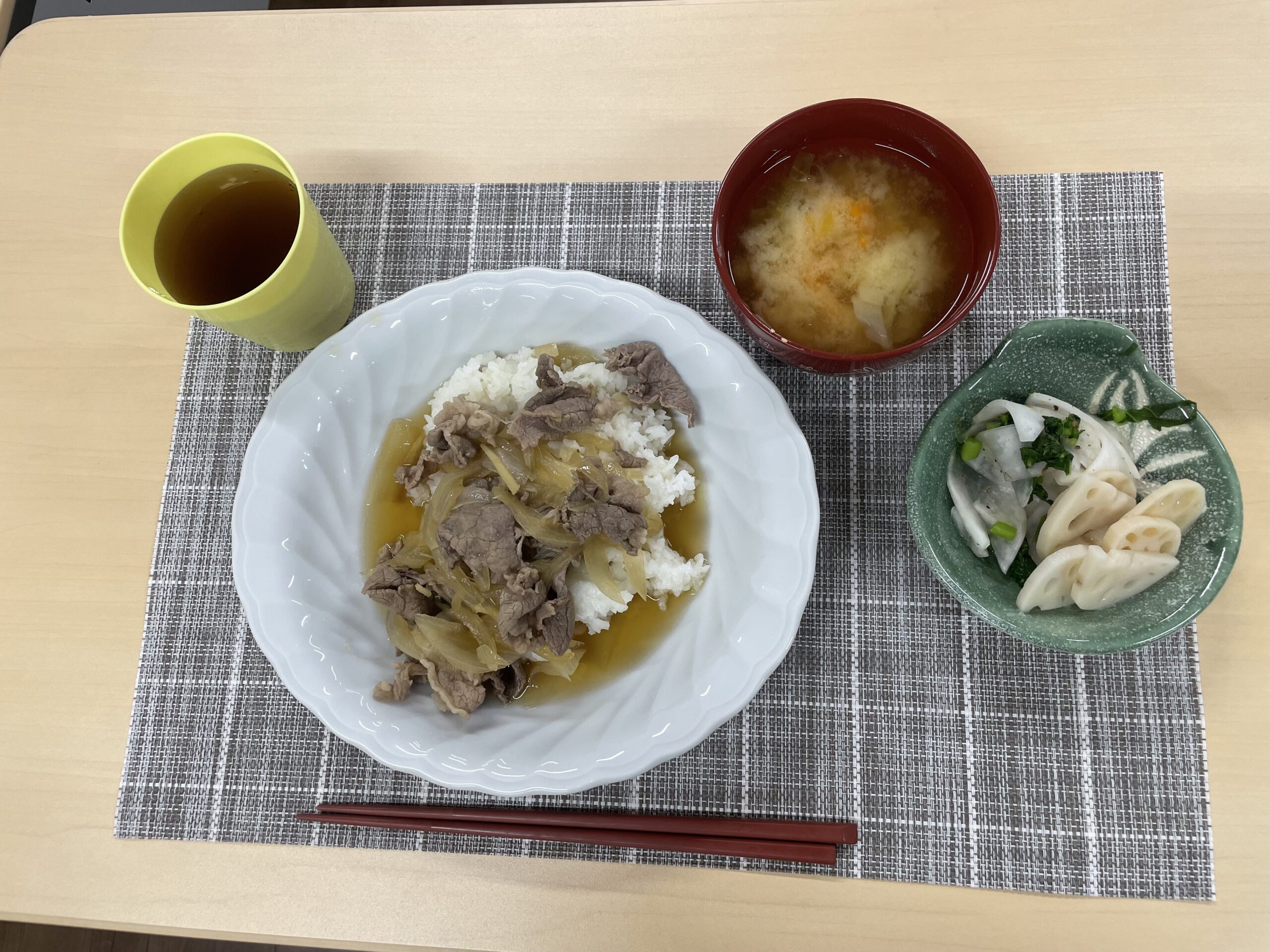 食事タイムのメニューは牛丼、かぶらの浅漬け、レンコンの甘酢、みそ汁でした。