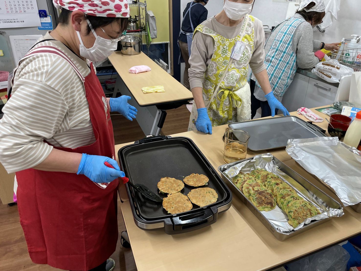 今週は「うさぎ食堂」さんが食事の準備をしてくれる日でした。今日のメニューは「お好み焼き」「おにぎり」「イチゴのパンナコッタ」それと宝塚NPOセンターからいただいたプリンがありました。