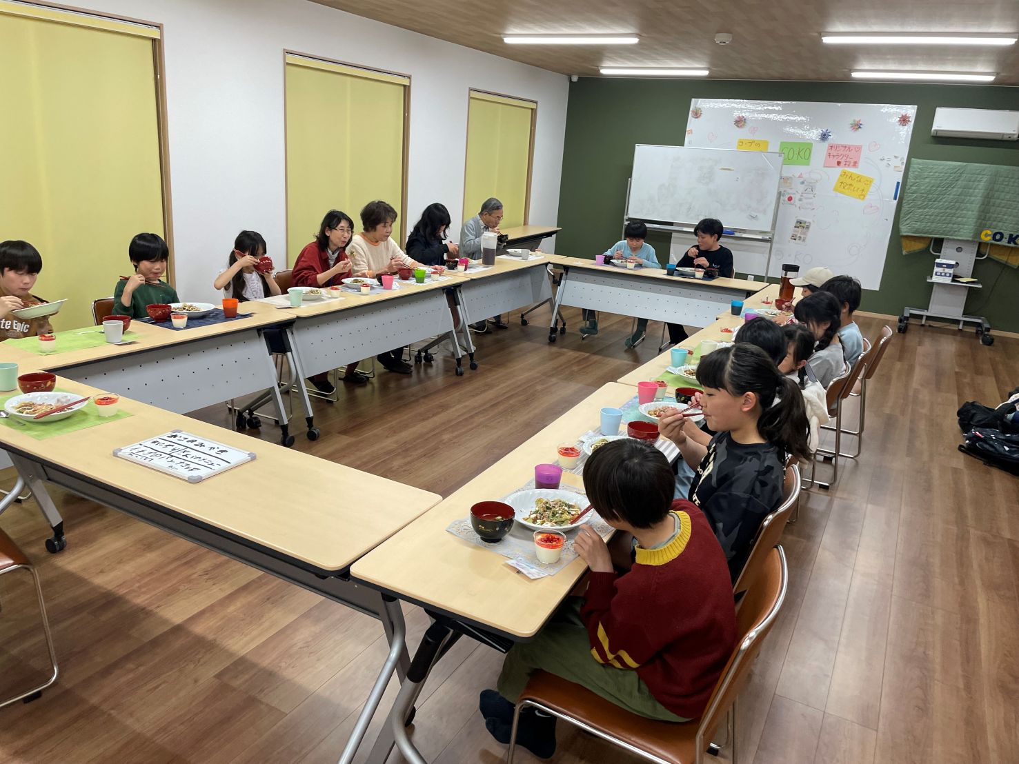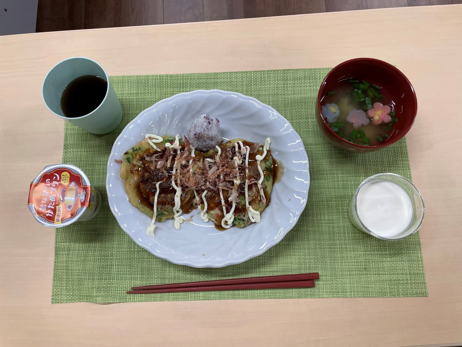 今日の食事を子供たちにインタビューしました。今日の食事はどうでしたか?「お好み焼きが美味しくて4枚も食べました」「お味噌汁が美味しかったです」「おにぎりはもっと大きいのが良かった」との声でした。