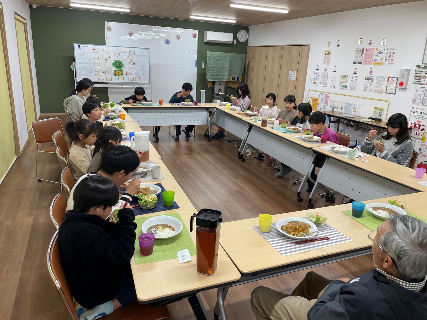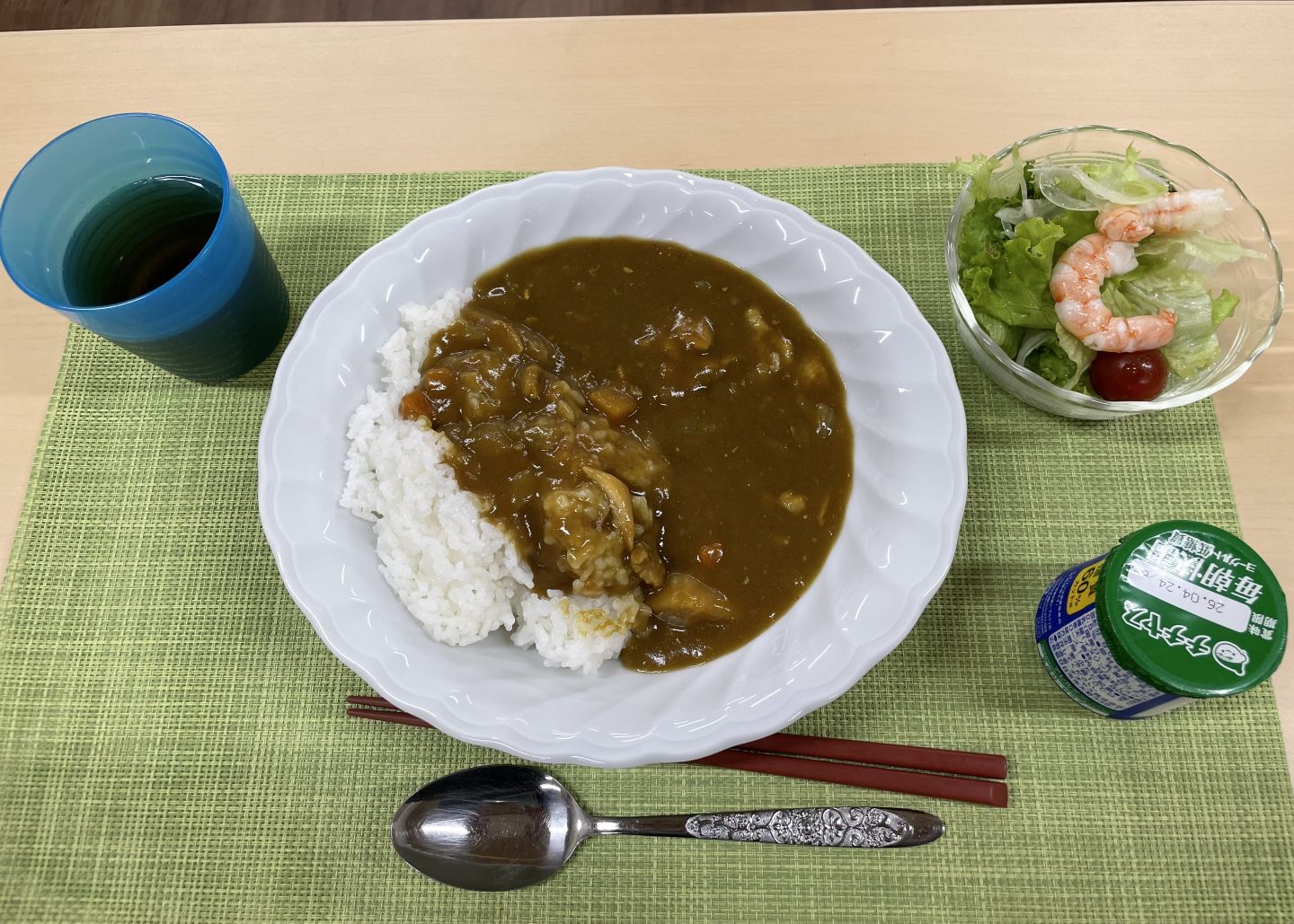 今週はカレーの日です。「チキンカレー」「エビ入りサラダ」「ヨーグルト」でした。サラダの一部は来る前に収穫した無農薬の野菜と、ヨーグルトは宝塚NPOセンターからいただいたものでした。カレーもサラダも自分たちで適量をよそって食べてもらいました。